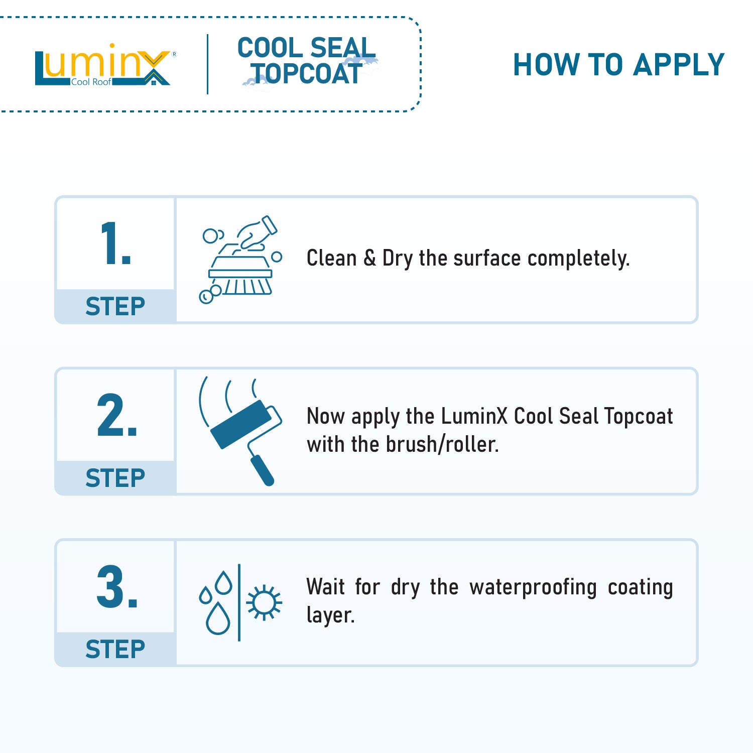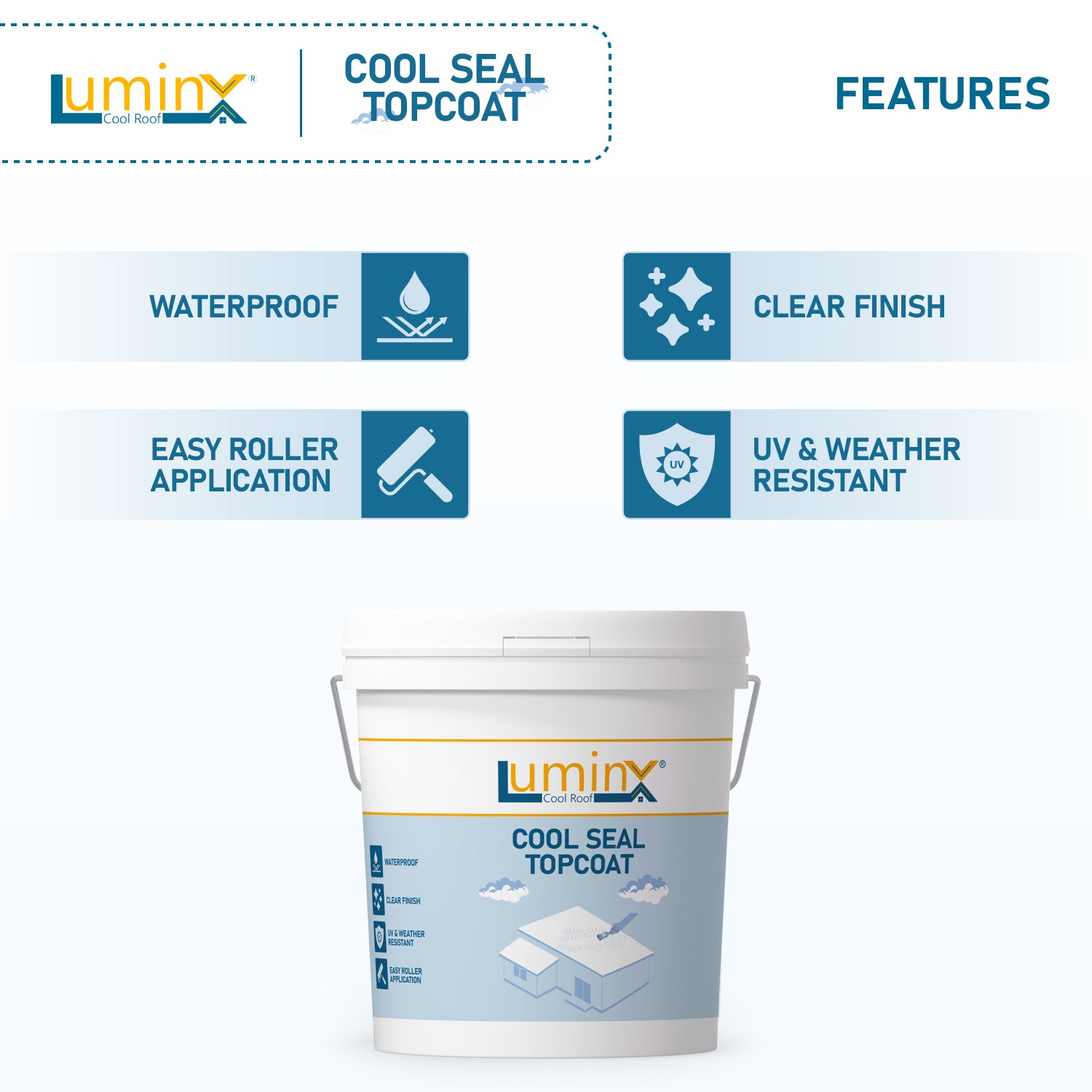 LuminX Cool Seal™ Topcoat is a transparent, high-performance protective sealer specially engineered to enhance and preserve the performance of High-SRI cool roof coatings and waterproofing membranes. Designed for long-term durability, it forms an ultra-clear protective layer that locks in solar reflectance while providing superior resistance against dirt pick-up, UV degradation, moisture ingress, and environmental pollutants.